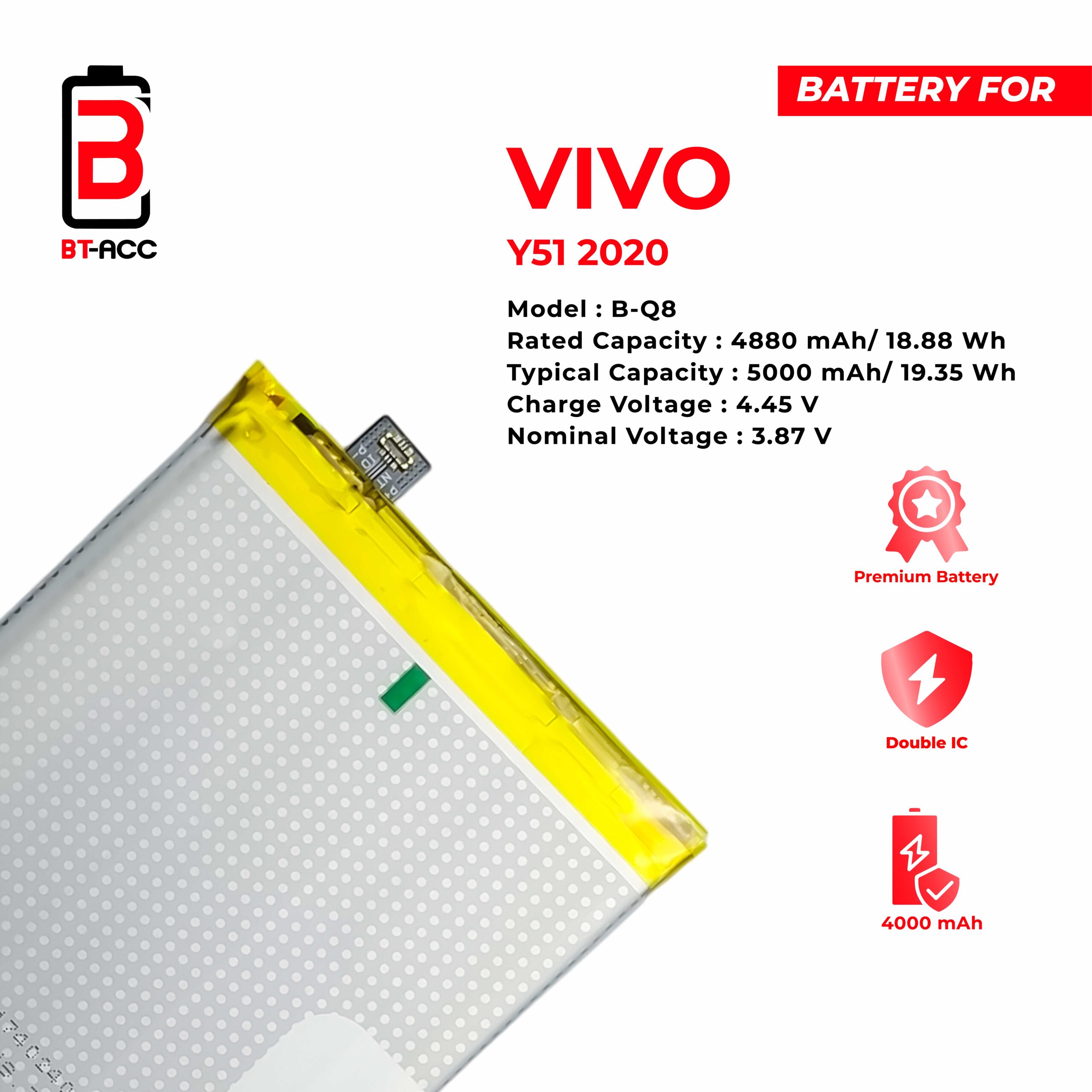 Dapatkan daya baterai yang lebih tahan lama untuk ponsel Vivo Y51 2020 Anda dengan BT-ACC Sebagai Pengganti.Baterai yang terbuat dari bahan berkualitas tinggi ini memiliki daya tahan hingga 5000 mAh dan dilengkapi dengan Double IC Protection sehingga membuatnya lebih stabil ketika digunakan.